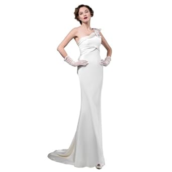 GEORGE BRIDE Fitted A Line One Shoulder Sweep/Brush Train Satin Wedding Dress With Feather Detail