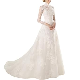 High neck and long sleeves style looks so junoesque.I am sure this High Neck Fit And Long Lace Sleeves With Lace Applications will amaze your bridegroom.Fully lined,Back button,Chapel Train.