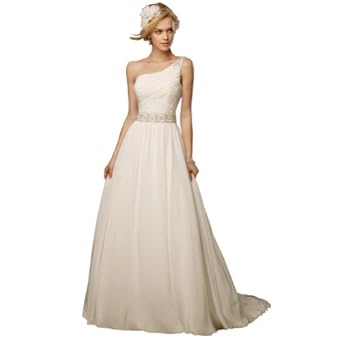 A-line style with the chiffon fabric leave the look of goddness.Fully lined,Chapel train,Back button.