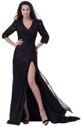 Herafa A-Line Black Evening Gowns, Made of High Quality Sequined Lace+Charmeuse+Satin+Chiffon, 3/5 Sleeve, Decorative Sequins, There are 4-8 bones on the bodice for evening dress, and 11-16 bones for wedding dress, which can show your figure better. Draping, simple and elegance design style .